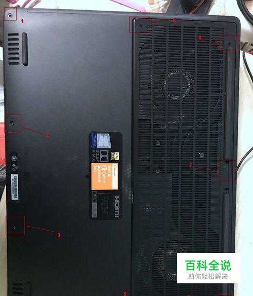 首先,游戏本后面有9个螺丝,笔者逆时针在下图标注了,其中第七个在后面的垫子下,直接扣下垫子就能看见了
