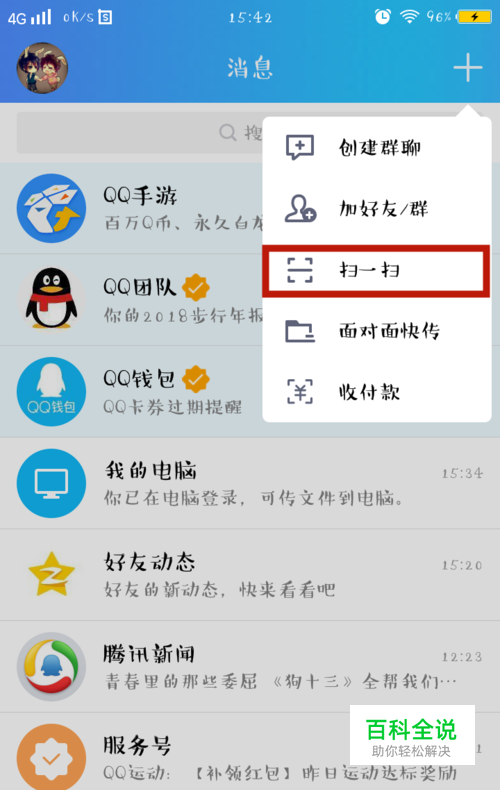 点开 +号,我们可以看到“扫一扫”,点击它,进入扫描界面。