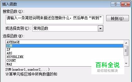 弹出“插入函数”对话框,在选择函数中选择“sum”函数,然后单击“确定”键