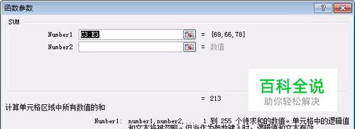 在弹出“函数参数”对话框时,也可以在Number1后面的文本框中输入语文成绩所在的单元格地址,Number2后面的文本框中输入数学成绩所在的单元格地址,Number3后面的文本框中输入外语成绩所在的单元格地址,然后按确定键,这样就计算了3个单元格数值的和。
