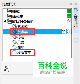 单击展开“默认对象属性”选项,在这里可以分别设置“美术字”和“段落文本”,首先选择“美术字”进行设置。