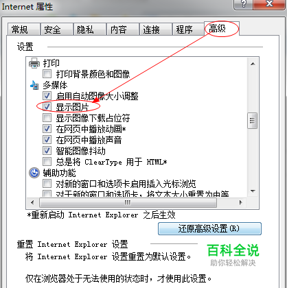 在internet选项窗口中选择“高级”选项卡,然后找到多媒体下的“显示图片”,确定它被选中。