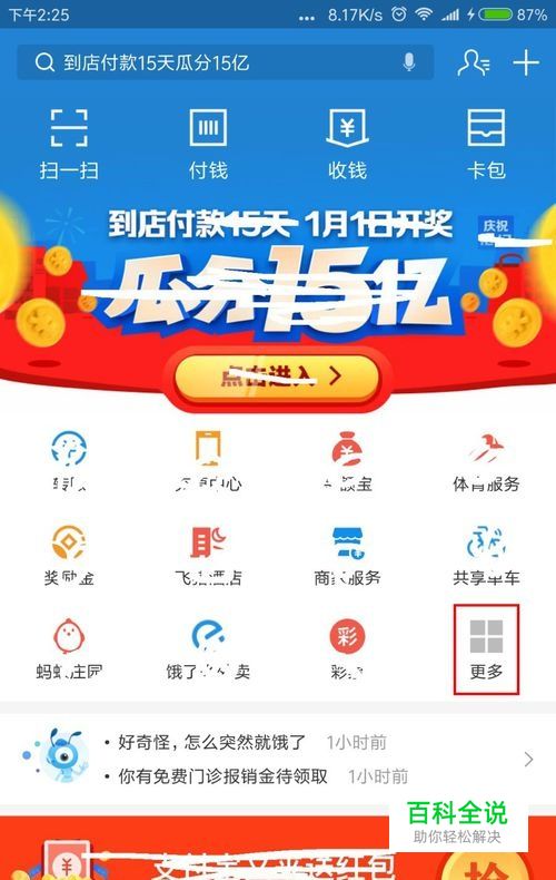 打开支付宝,点击红框所示“更多”,进入全部应用界面。