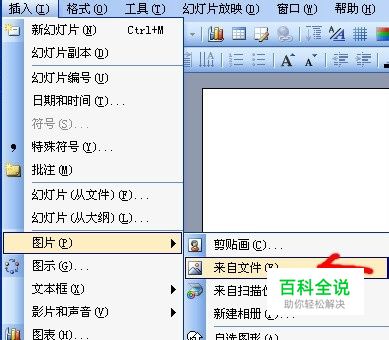打开一演示文稿,选择“插入”菜单中“图片”项,在下一级菜单中选择“来自文件”。
