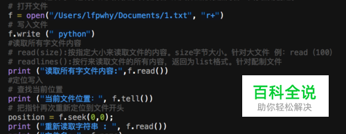 # 打开文件 f = open("/Users/lfpwhy/Documents/1.txt", "r+") # 写入文件 f.write (" python") #读取所有字文件内容 # read(size):按指定大小来读取文件的内容。size字节大小。针对大文件 例:read(100) # readlines():按行来读取文件的所有内容,返回为list格式。针对配制文件 print ("读取所有字文件内容:",f.read()) #定位写入 # 查找当前位置 print ("当前文件位置:", f.tell()) # 把指针再次重新定位到文件开头 position = f.seek(0,0); print ("重新读取字符串 : ", f.read()) print ("文件名: ", f.name) print ("是否已关闭 : ", f.closed) print ("访问模式 : ", f.mode) # 关闭文件 f.close()