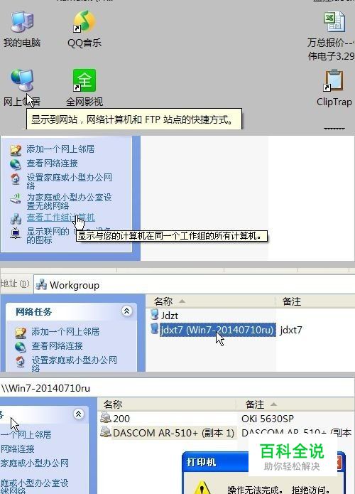 表现一:网上邻居,查看工作组计算机,找到共享打印机所在的电脑 Win7-20140710ru,找到要共享的打印机DASCOM AR-510+ (副本 1),双击提示“操作无法完成。拒绝访问”。