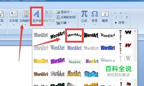 打开word2007,在最上方的菜单栏中选择,之后点击,选择第一行和第三列交汇的地方的艺术字。