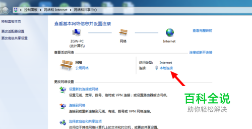 在弹出的“网络和共享中心”中,找到“本地连接”进行单击。如图所示。