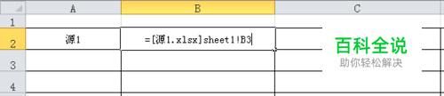 在目标单元格B3中,我们输入公式“=[源2.xlsx]Sheet1!B3”,回车确定。