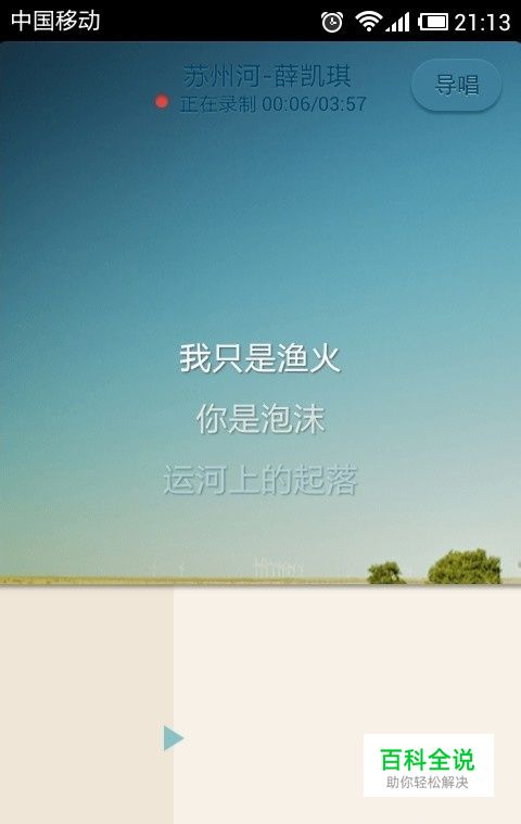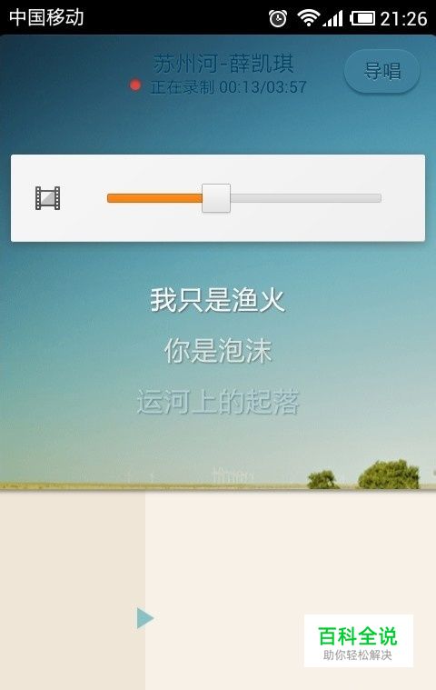 打开手机唱吧,不戴耳机,在开始进行录制的前几秒钟,把伴奏的声音调整到刚好能听的清楚的大小,就是比正常播放的时候低得多,但是又不影响你跟唱的状态。OK,开始录制。