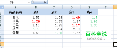 突出显示出一行中的最大值或最小值,方便日常所需要。下面我们就以水果价格为例显示出各门店的最低价与最高价。