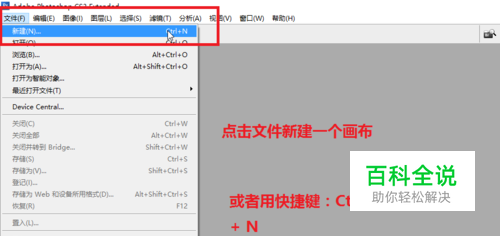 在PS工具中点击最左上角的文件中选择新建 ,或者是用快捷键Ctrl + N 新建一个画布