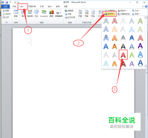 点击插入选项卡,点击文本工具组中的艺术字按钮,选择喜欢的艺术字效果,如图所示。