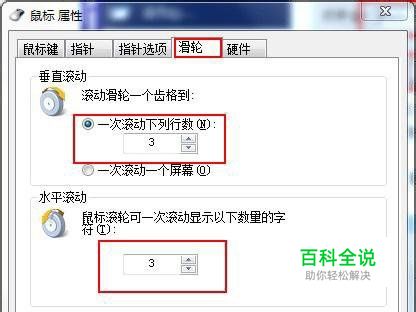 步骤二、在打开的鼠标属性窗口上有鼠标键、指针等选项,因为需要调整的是滚轮参数。所以在这里我们切换到“滑轮”选项卡。然后在下面参数设置上设置“滚动”的一次滚动下列行数。当然这个看用户的个人习惯自行设置(其中包括垂直和水平滚动参数设置)。设置完成后在点击“确定”即可生效。如图所示: