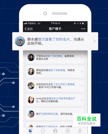 智能雷达 客户点击名片或通过名片功能进入经营宝小程序浏览了其他页面,即可实时收到消息,都可以在AI雷达中实时显现,从而可以分析访客的兴趣偏好,从而有针对性的进行实时营销跟踪。