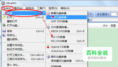 双击打开UltraISO。 打开后,显示的是默认新建数据光盘映像。 如果要新建其他类型的映像文件,请选择【文件】-【新建】,会提示添加此种类型文件所需要的文件。