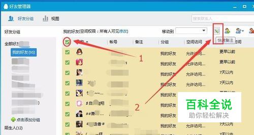 在昵称前打钩,将所有好友全部选中,然后点击右上角的快速备注,如下图。