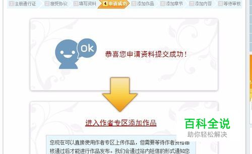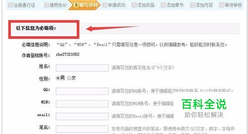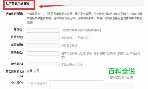 填写必填项信息:姓名、性别、联系方式、笔名,作者专区登录密码;选填项填写;点击”提交“