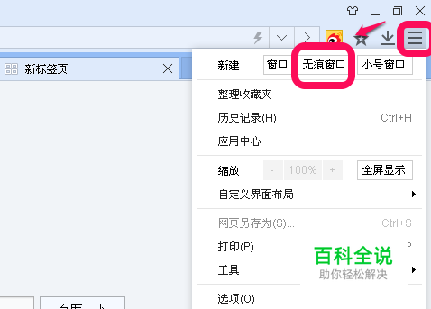 首先,我们打开百度浏览器,点击右上角的菜单图标,下拉菜单,点击 无痕窗口打开即可,如图。