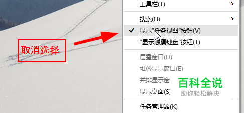 在任务栏点击右键,在弹出的菜单中把“显示任务视图”的勾去掉