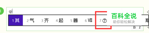 2.第一种方法就是在文档空白处利用输入法自带的符号来打出,比如直接在输入法拼音模式下输入【qi】这个拼音,即可找到并选中目标符号即可,如下图所示。qi