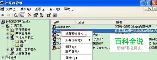 从弹出的窗口中,我们打开左侧的“系统工具”--“本地用户和组”--用户,然后从右边找到你需要设密的用户,当然如果是改其他人的密码,你需要有超级用户权限,用右键单击该用户名,然后从弹出的菜单中点击设置密码。剩下的的就是录入两遍密码了。