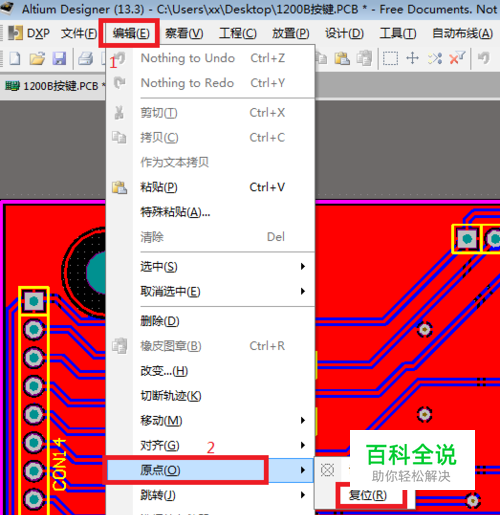 一,使用AD13打开一个即要导出坐标文件的PCB文件,然后选择“ Edit(编辑)”→ “Origin(原点)”→ “Reset(复位)”,对PCB文件重设原点。如果你已经设置好原点,这一步可省略。具体操作如下图所示: