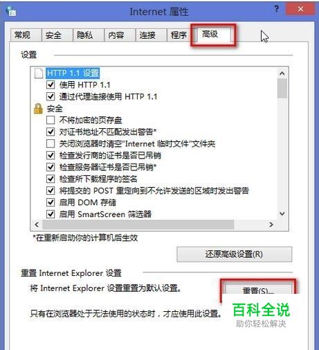 方法一,将IE浏览器设置重置为默认设置,见下图