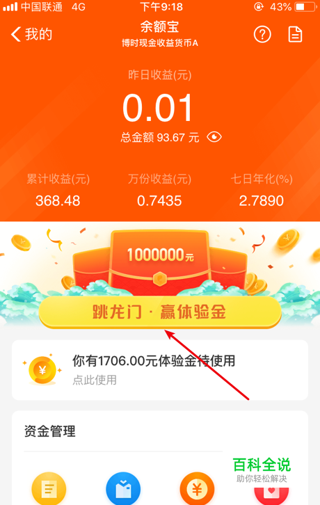 我们点击打开余额宝,然后点击页面如图所示的跳龙门赢体验金