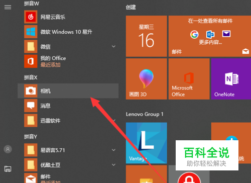 我的电脑是win10系统,其他系统也可以在应用程序里边按照这个办法找到相机功能的,如图所示,点击左下角的 开始菜单,然后找到相机。