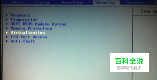 用左右键将菜单栏移到security菜单栏,然后用上下键移动光标到Virtualization,回车进入。