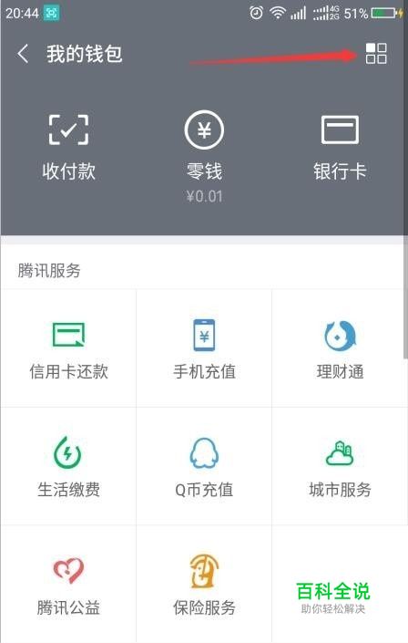 进入我的钱包界面后,点击右上角的四个小方块按钮。