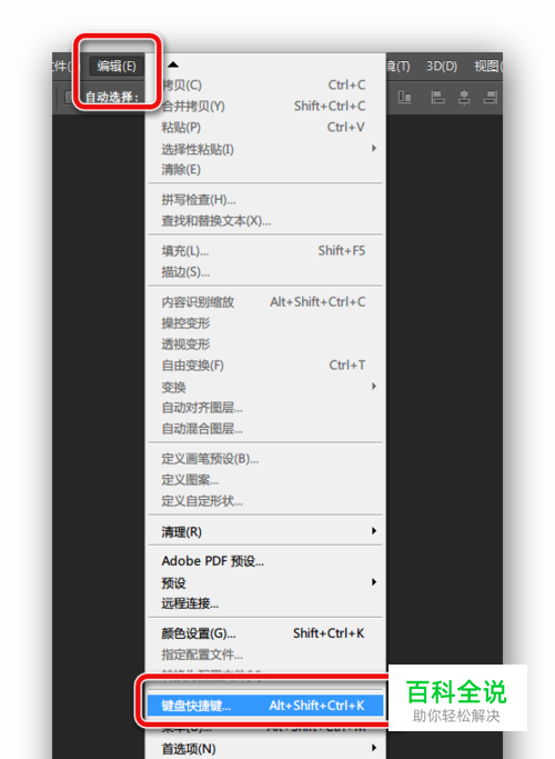 选择菜单栏的编辑菜单,点开后往下拉,找到“键盘快捷键”按钮,单击它,即可弹出设置面板,或者直接选择使用它的快捷键Ctrl+Shift+Alt+K,调出面板