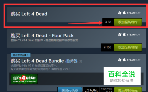 进入后下拉找到购买Left 4 Dead,添加至购物车。
