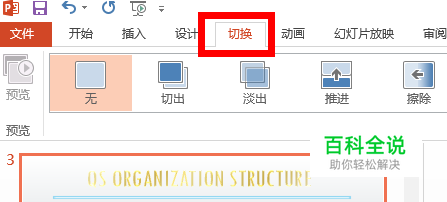 打开PPT,进入“切换”菜单。
