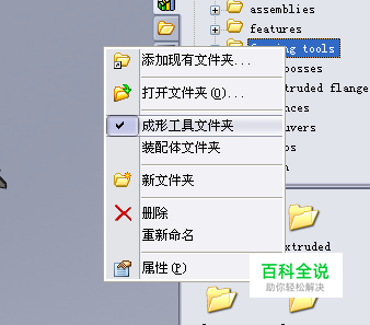 一、在工作界面右侧的设计库中,forming tools文件夹下为成型工具,需要右键forming文件夹后,选择“成形工具文件夹”才能使用模具冲压成形所需要的特征。如果你不选择,则无法实现冲压成型,只能形成单独的零件,或者独立的特征,而无法在零件表面经行模具冲压。如下图所示。