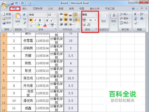 在这里我们首先选中要设置格式的数据,然后在菜单栏的"开始"中找到"数字"选项卡