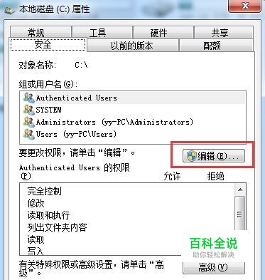 这个就不需要切换用户,直接右键C盘,点击属性,然后点击安全,再点击编辑。