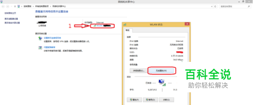 打开网络和共享中心后,我再打开如图中1所圈的网络,单击选中打开wlan对话框后,我在再单击选择无线属性;