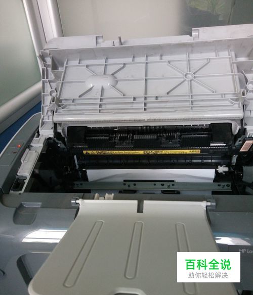 为了检查纸张卡在什么位置,打开机盖,抽出硒鼓,可以看出打印纸正好卡在硒鼓的进口处,并且纸张的前面有皱纹,由此可以判断在硒鼓入口处应有异物或传动故障。