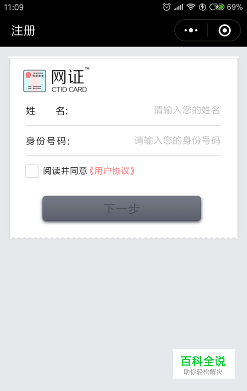 进入网证注册界面的时候需要首先输入我们的名字,同时还得输入自己的身份证号码,最后点击下面的协议同意点击下一步。