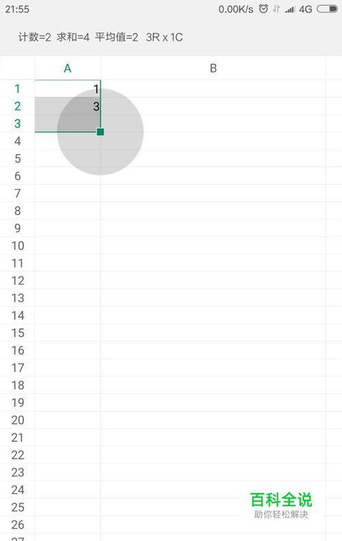 用手机WPS表格软件打开一个表格文件,在其中一列的两个单元格输入1,另一个输入3,当然也可以是你需要的其它内容,这里仅仅用于演示。输入完毕后,选中两个单元格。