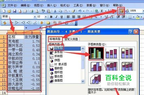 首先需要选中需要制作柱状图的区域 然后点按工具栏上的图表向导按钮 然后在弹出的图表向导4步骤之一中点按左侧的图表类型下面的柱状图 按箭头所指选择子图表类型 然后点按完成