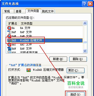 2、然后切换到“文件类型”标签页,并找到你要修改设定的文件类型 (以文件后缀名来选取),并点击“高级”按钮。