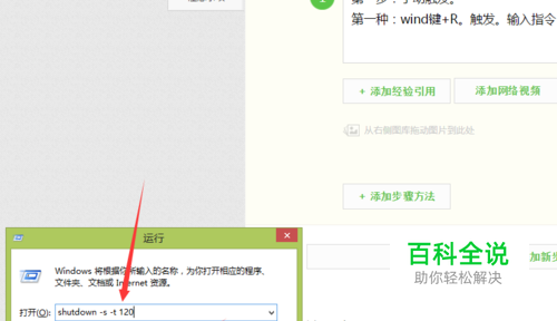 第一种:wind键+R。触发运行窗口。输入指令:“shutdown -s -t 120”。120单位为秒。