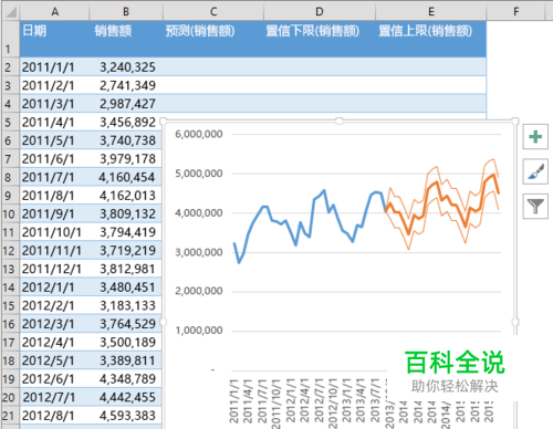 二、一键式预测。在 Excel 的早期版本中,只能使用线性预测。在 Excel 2016 中,FORECAST 函数进行了扩展,允许基于指数平滑(例如 FORECAST.ETS() …)进行预测。此功能也可以作为新的一键式预测按钮来使用。在“数据”选项卡上,单击“预测工作表”按钮可快速创建数据系列的预测可视化效果。在向导中,还可以找到由默认的置信区间自动检测、用于调整常见预测参数(如季节性)的选项。