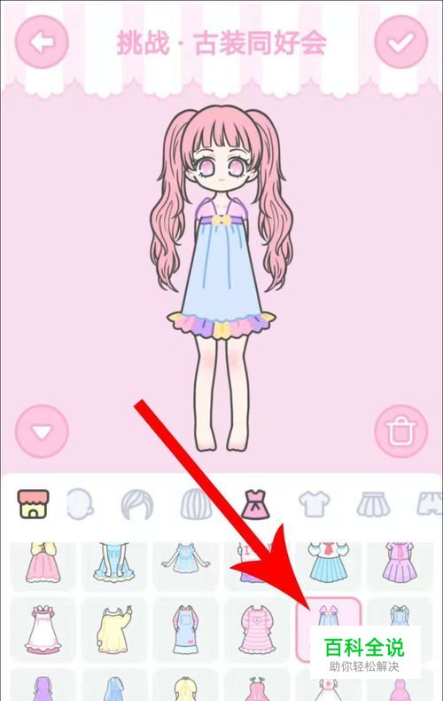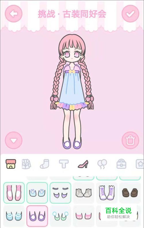 复古鞋子 在基本穿搭中,还需要一双鞋子,总不能光着脚去参加古装同好会吧,对鞋子进行比对查看,这双紫色的鞋子(位置见下图)更复古些,与古装衣服也很搭。 好,做好穿搭之后就赶紧穿上它们点击“√”,这样就可以挑战过关了