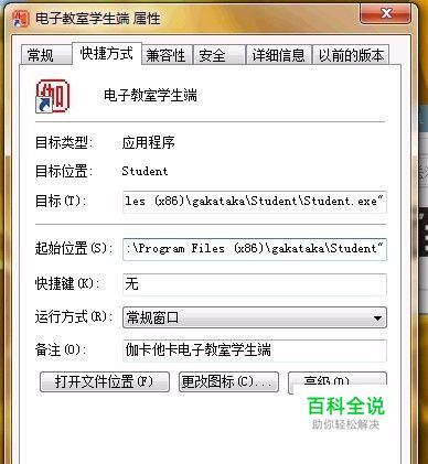 找到这个伽卡他卡学生端所在的文件夹。通过右击它的快捷方式———属性来查找。点击“打开文件位置”打开。