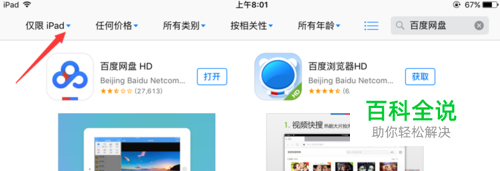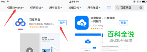 我们打开app store,然后搜索百度网盘,出现了ipad版本的百度网盘,我们将其选择为仅限iPhone