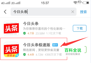 在应用商店输入今日头条,在搜索内容中找到今日头条快速版,点击右方的下载,将软件下载到手机。
